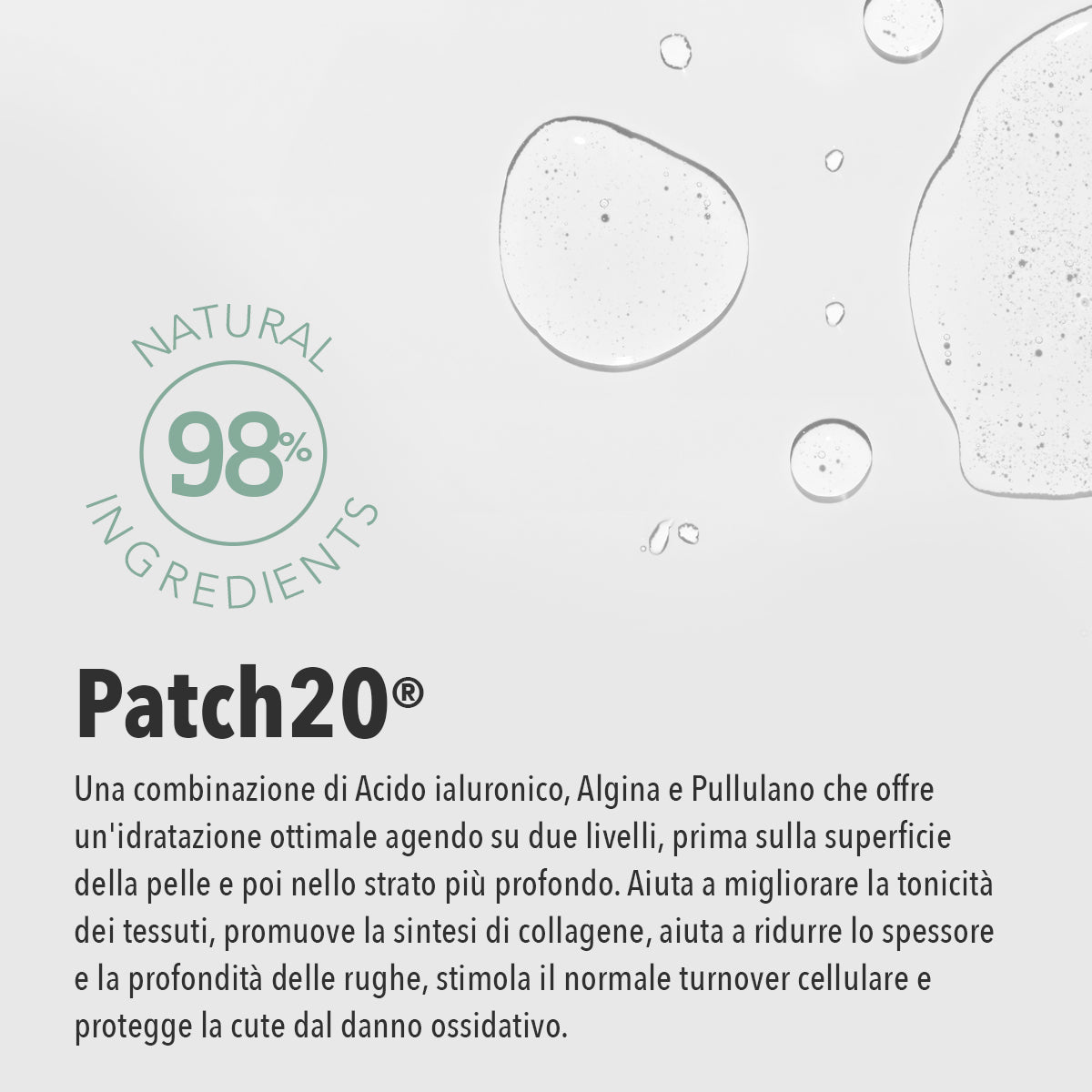 A combination of Hyaluronic Acid, Algin and Pullulan that provides optimal hydration by acting on two levels. First on the skin's surface, then in the deeper layer. It helps improve the firmness of tissues, promotes collagen synthesis, helps reduce the depth and thickness of wrinkles, stimulates normal cell turnover and protects the skin from oxidative damage